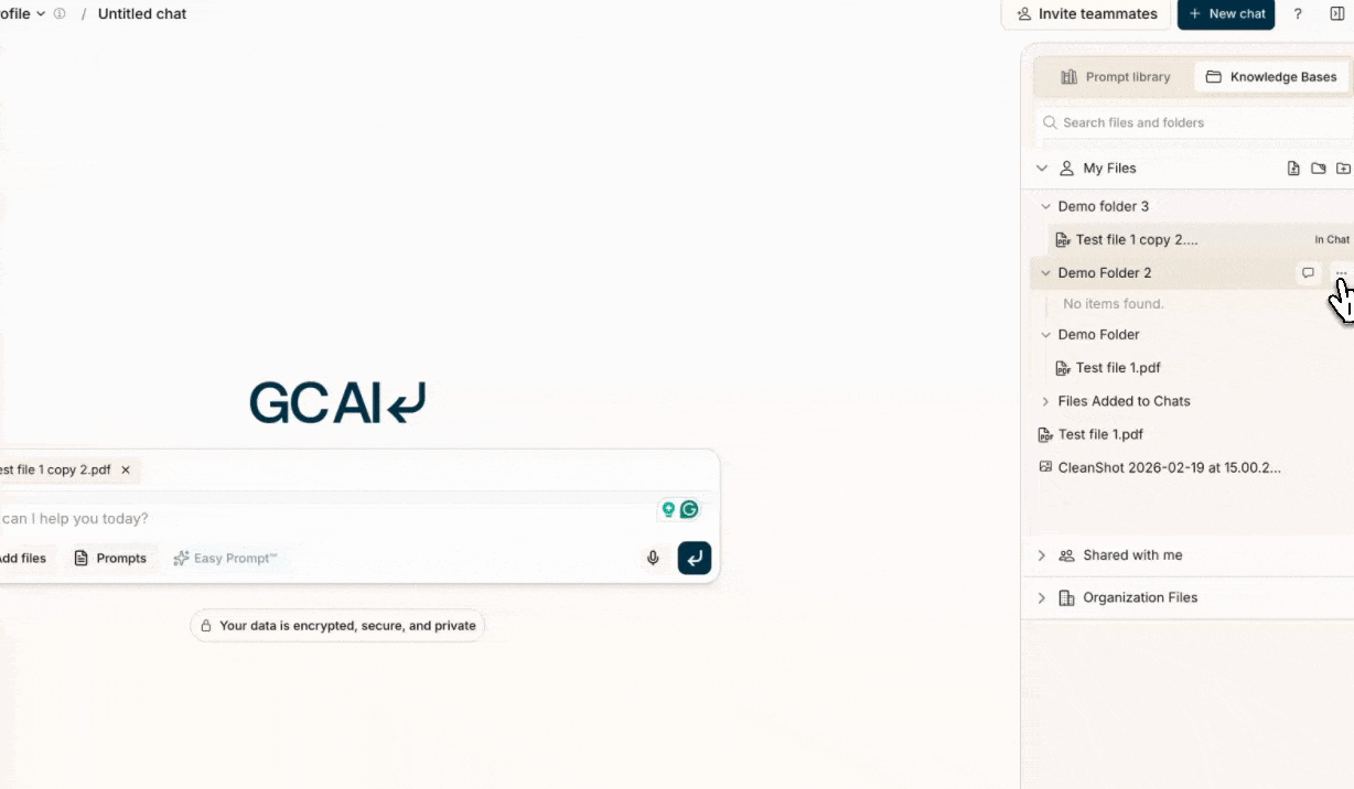 - Access multiple file spaces (My Files, Shared, Organization Files) in a single chat