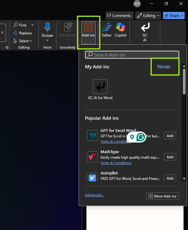 - Open Word, we will uninstall the current GC AI Add-in. Click on Add-ins on the upper right area.