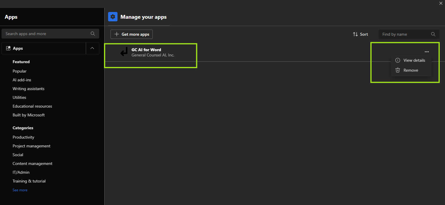 - You should see the GC AI add in in the menu > Click on Manage