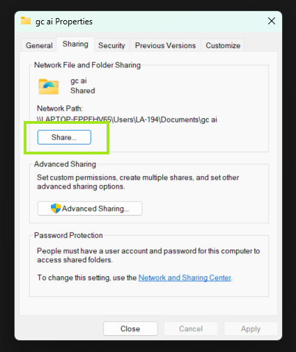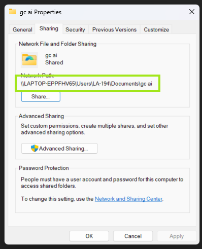 - Go back to your Documents folder > Right click on the folder you created > Properties > Sharing > Copy the path to the folder for this example, the complete path to my gc ai folder is: