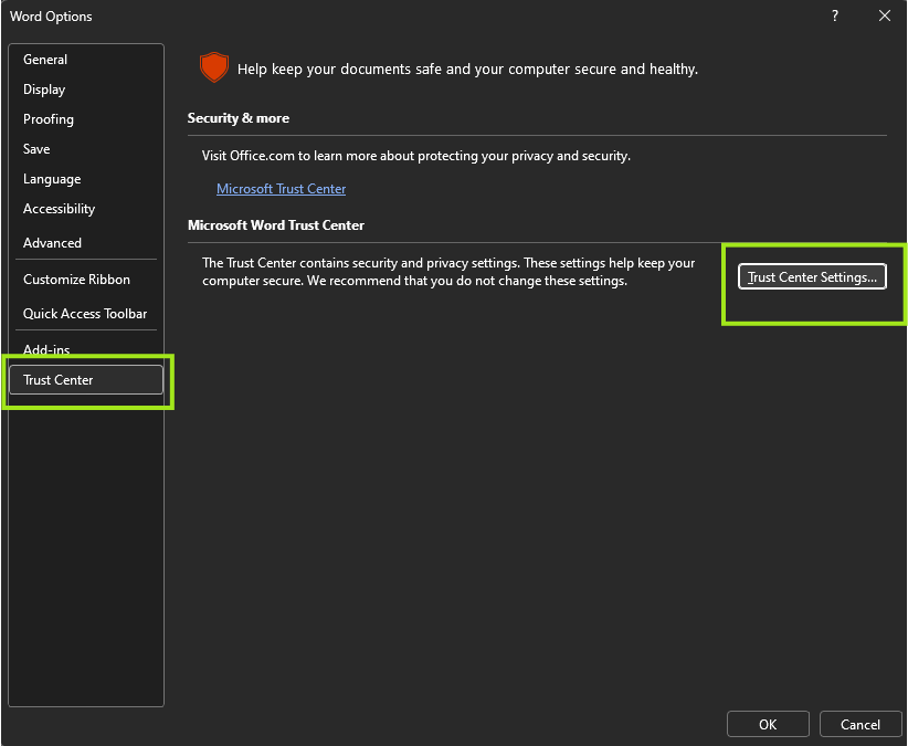 - Click on Trust Center > Trust Center Settings