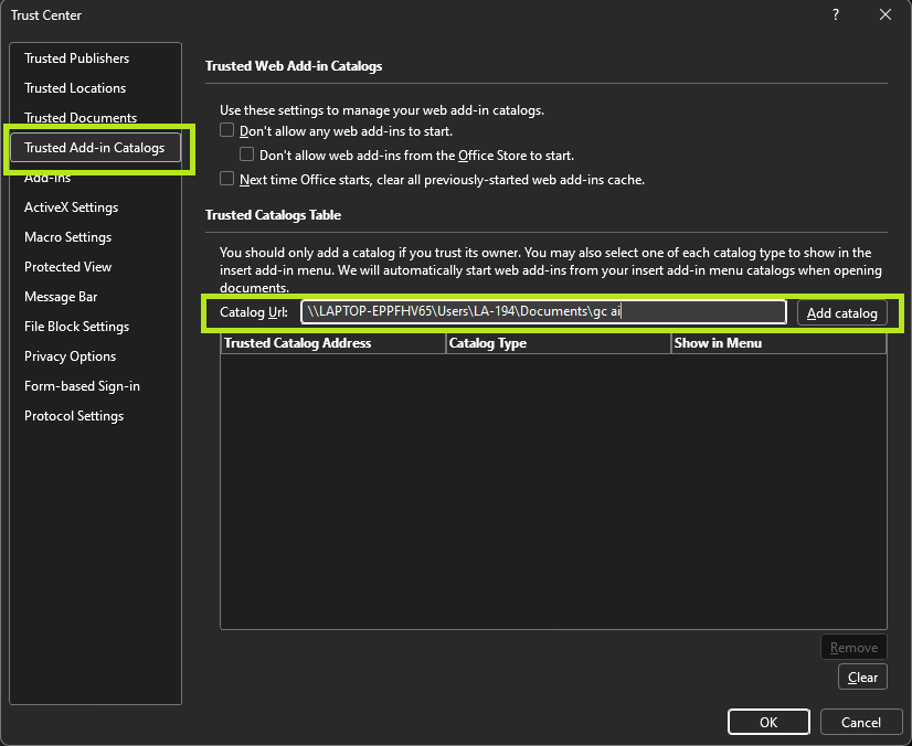 - In the Trust Center Settings > Select Trusted Add-in catalogs > Copy the path to the folder you created in the Catalog URL field > Click Add Catalog.