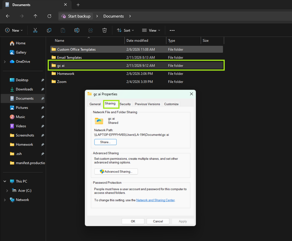 - Go back to Documents > Right Click the folder you created (in this example: gc ai) > Select Properties. The folder Properties window will open > Go to the Sharing tab.